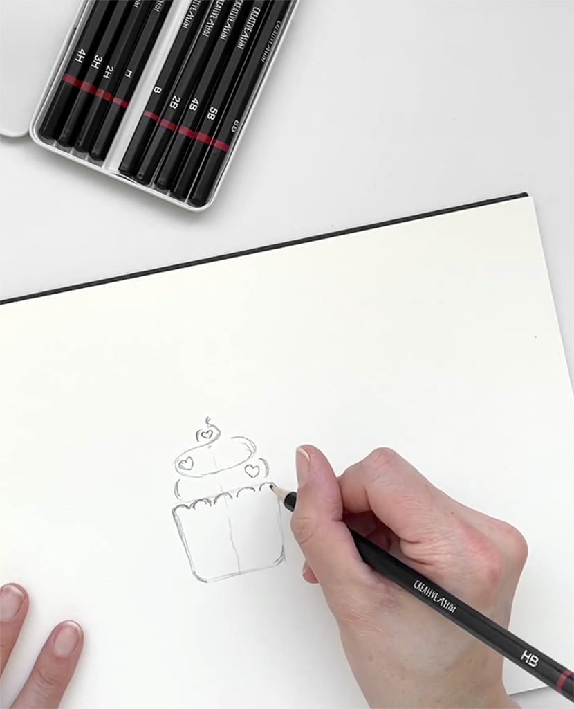 Ik bekijk plaatjes op Pinterest, schets, probeer en perfectioneer. Schetsen doe ik in een schetsboek. Er zijn verschillende soorten, maar een schetsboek met ringband vind ik zelf het meest prettig.  Dit schetsboek ligt plat als hij opengeslagen is en ik kan er gemakkelijk een vel uit halen. Grafietpotloden zijn ideaal om te schetsen. In een doosje zitten verschillende potloden, met zachte en harde punt, HB is gemiddeld, B is zachter en H is harder. Probeer vooral uit wat jij fijn vindt werken. Voor een normale schets gebruik ik het HB potlood. Als je de schets wilt perfectioneren kun je met de zachte potloden bijvoorbeeld schaduwen aanbrengen.