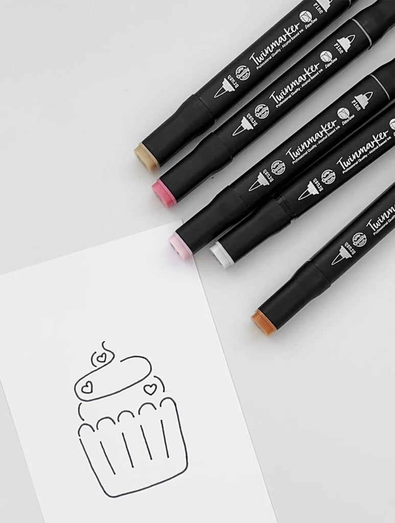 Ik heb voor de cupcake-doodle vijf kleuren alcoholmarkers uitgekozen: 2 roze tinten voor de topping, 2 bruine tinten voor het cakeje . En een lila-paarse kleur voor het cupcakevormpje.