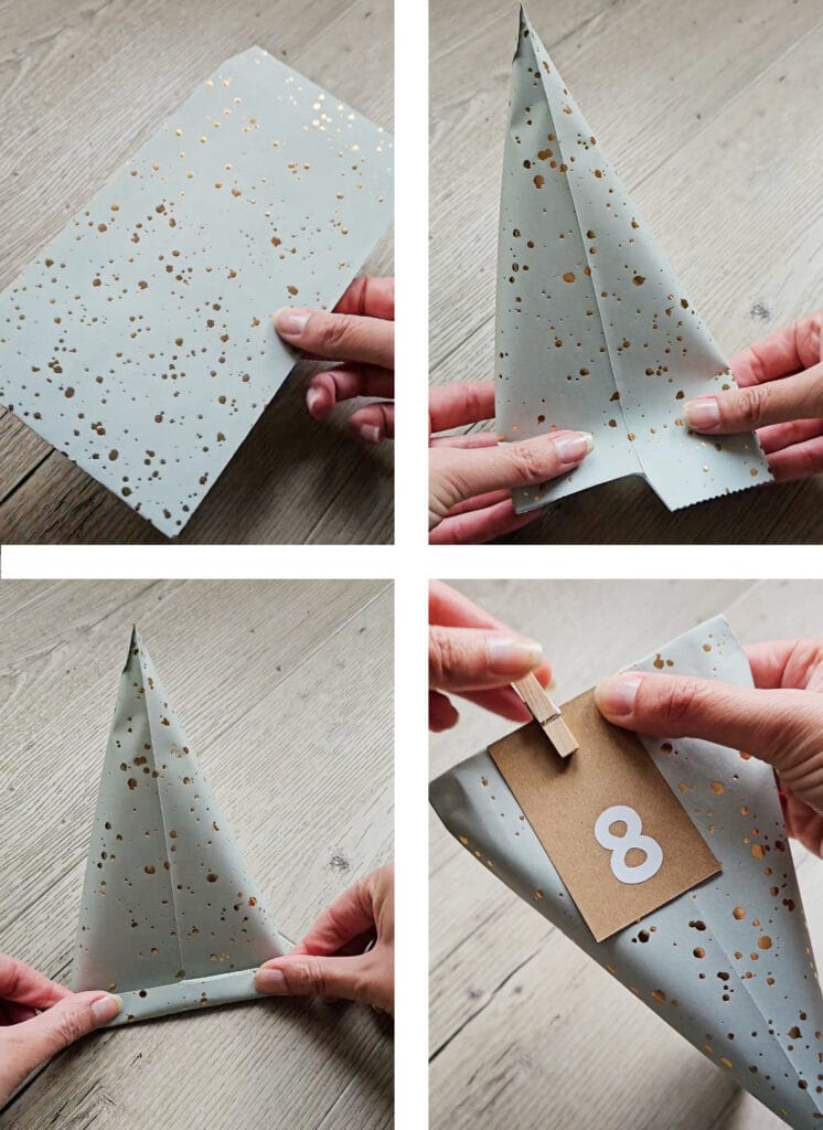 Van een plat cadeauzakje maak je eenvoudig een driehoekzakje. Het enige dat je hoeft te doen is de opening overdwars dicht te vouwen. Supersimpel, maar heel handig als je cadeautje net plat is, of als je lekkere snoepjes wilt verpakken.